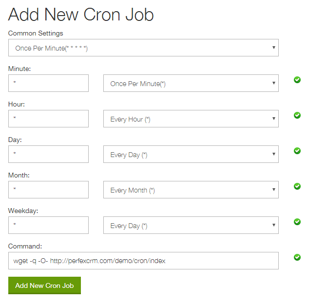 Change the url according to your base url where Perfex CRM is located. You can check your cron url in Setup->Settings->Cron Job