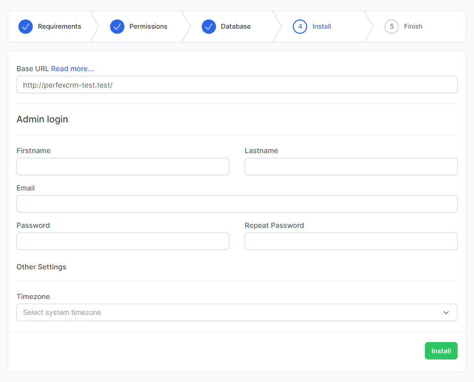 Assume that you uploaded the files to “crm” folder, navigate to eq. http://yourdomain.com/crm/install – Keep in mind that you need to adjust the URL based on where you uploaded the files. If you are installing on subdomain named eq crm you need to access the url like http://crm.yourdomain.com/install.